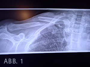 Der rechte Schultergürtel wurde mit einem Gilchrist - Verband ruhiggestellt und eine Woche später erfolgte im erstbehandelnden Krankenhaus bei drohender Perforation eine offene Reposition der instabilen Fraktur und eine Osteosynthese mit einer winkelstabilen Platte.
