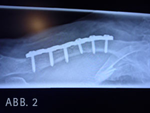 Die Schraube ist unterhalb der Klavicula sichtbar (Abb. 3), weil die Klavikula an dieser Stelle nur ca. 12 mm dick ist und eventuell der Winkel des Bohrlochs etwas anders lag. Auch könnte die Schraube etwas tiefer in das Bohrloch der Platte gerutscht sein.