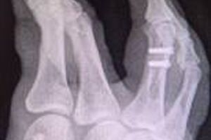 Es bestand am 22.05.2020 eine tragfähige Indikation für eine offene Reposition und osteosynthetische Versorgung der dislozierten Mehrfragmentfraktur am rechten Ringfingergrundglied. Das ärztliche Vorgehen war fehlerhaft, weil die Fraktur nicht achsengerecht versorgt wurde, ein Rotationsfehler verblieb und eine zeitnahe Korrektur nicht eingeleitet wurde. Die Ärzte der beklagten Klinik räumten in ihrer Stellungnahme ein, dass eine Fehlstellung des rechten Ringfingers vorgelegen habe. Die Drehfehlstellung des rechten Ringfingers sollte sich durch Krankengymnastik und Ergotherapie korrigieren. Eine zeitnahe Korrekturosteotomie war jedoch indiziert. Entscheidend zum Nachweis einer achsengerechten Stellung und zum Ausschluss eines verbliebenen Rotationsfehlers sind die klinischen intra- und postoperativen Stellungskontrollen der Finger beim aktiven und passiven Faustschluss und der Lauf der Finger (Abb.4)